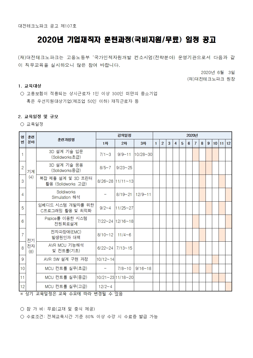 대전테크노파크 2020년 기업재직자 훈련과정(국비지원/무료) 일정 안내